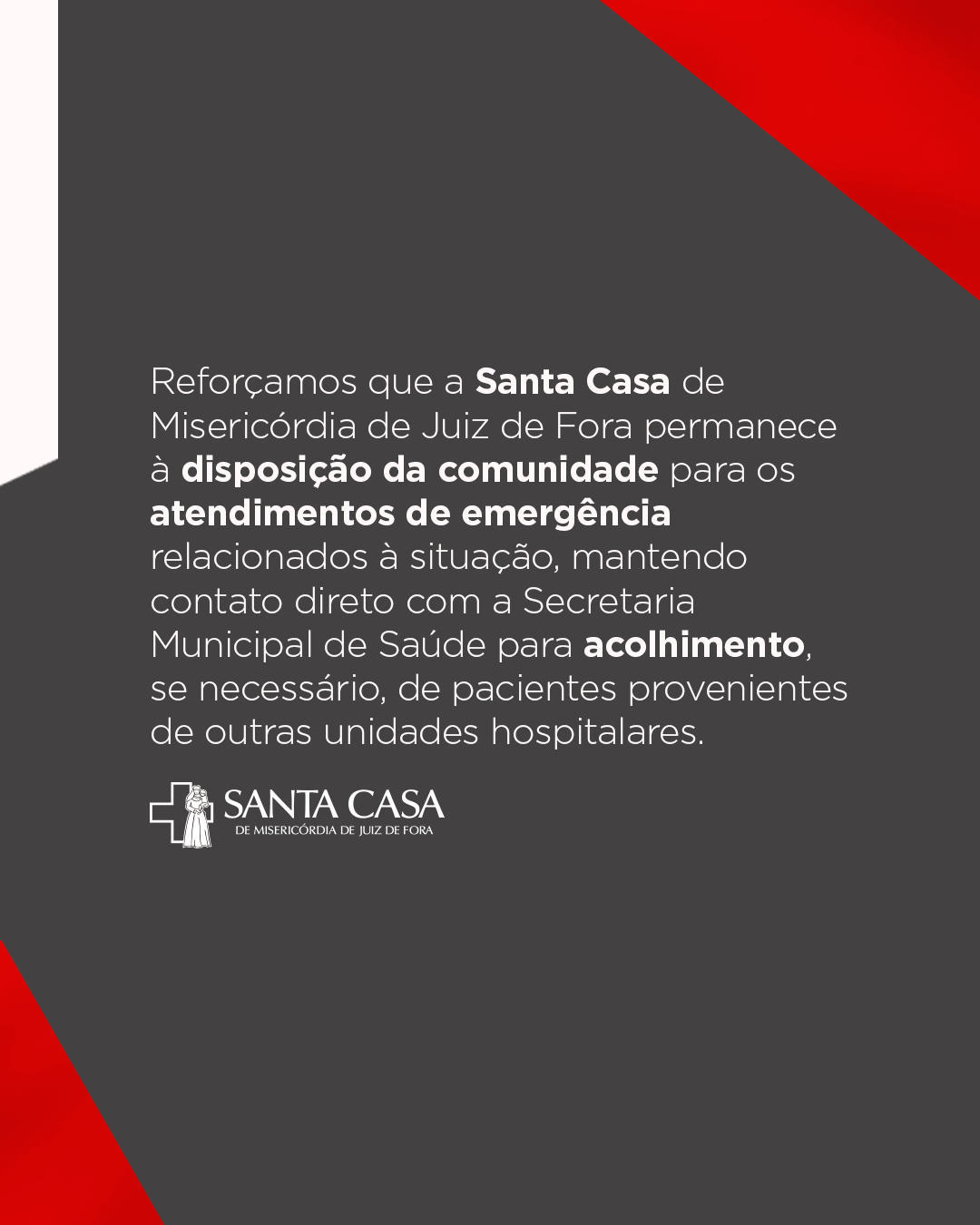 Diante da situação de calamidade pública que atinge nossa cidade em decorrência das fortes chuvas, a Santa Casa de Misericórdia de Juiz de Fora manifesta sua solidariedade à s vÃtimas e à s famÃlias impactadas. Em razão desse cenário, […]Diante da ...